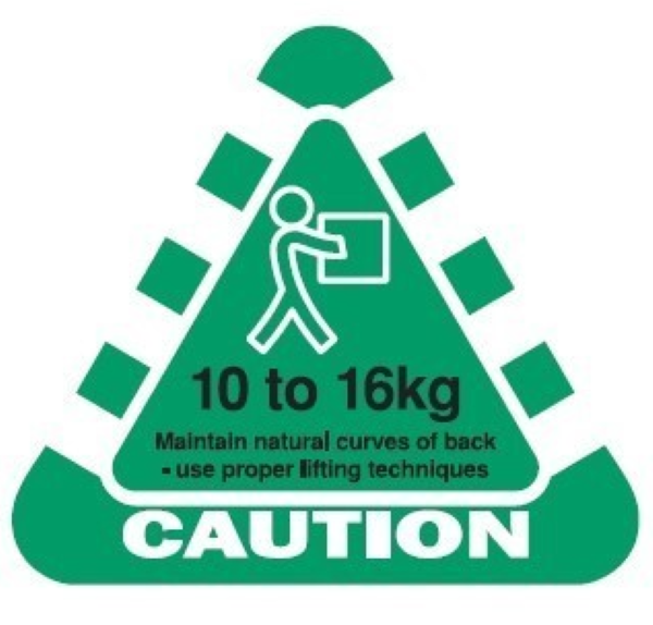 LABEL 'CAUTION 10-16KG' 50mm X 50mm W/LINER GREEN ROLL